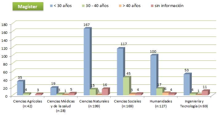 Comparación área de estudio / rango etario Becarios Doctorado – Magíster Nacional 2008-2011